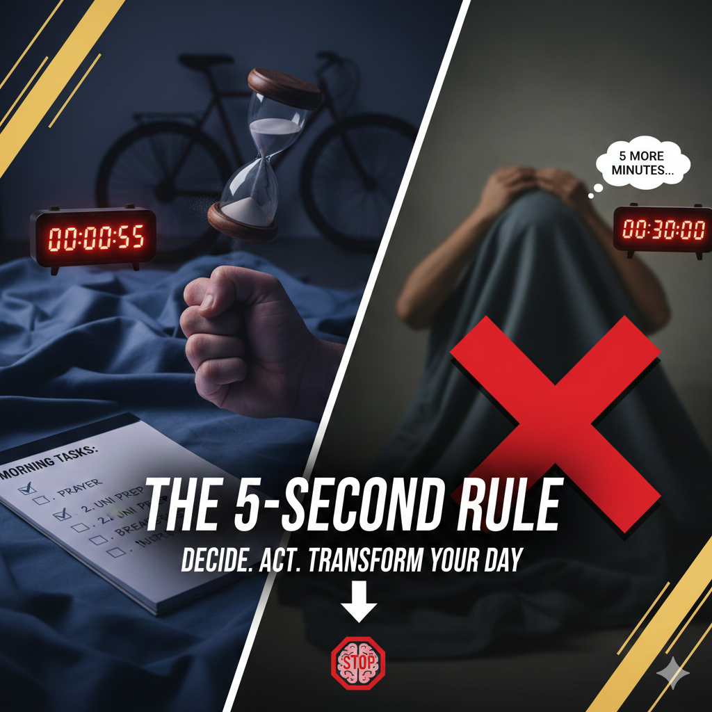 Just yesterday I cycled from my university to the railway station. The distance between the railway station and the university is more than 20 kilometers. When I completed this journey on a bicycle, I took some pictures on the way and shared them with my friend. My friend said, "Dude, you are very physically fit. If I had traveled so much on a bicycle, I would have got muscle footage." Then he told me, "Dude, I want to make myself irregular. I want to correct my routine. So what should I do?" I told him that I am using a method today in which I have set some tasks for myself in a notepad. Some two or three things that I have to do this morning. I sit down the night before and make these tasks and try to do them the next morning. I also tell myself that if these tasks are not in my morning, then there will be no point in spending my day. So I give priority to these tasks first. When I sent this to him through a voice note, he replied to me in advance that he also does such things. He keeps trying and then he told me one thing that a boy had also told him a five-second rule which he is trying to implement today. He told me that when you wake up in the morning, within five seconds you should be completely awake because within five seconds if you don't know, your mind will tell you that now it's five minutes and solo or 10 minutes and solo or half an hour and show. And in this way, if your mind triggers you even once that it's five minutes and solo or ten minutes and solo, then you will keep postponing it and this thing will become your habit. As soon as he told me this through a voice note through WhatsApp, I was forced to think because I often try to wake up at six in the morning on cold days and after waking up at six, I do my necessary work, start my day with worship and start preparing for my university. But it happens that I also sleep with an alarm for six but at half past six I wake up around 10:00 which means that my worship is missed or my university time is delayed a little or I have to skip my breakfast. So I completely understood that if we do not take a small decision quickly, then our brain starts making decisions on its own and also that in a duration of just five seconds if we do not wake ourselves up, our brain tells us to sleep and believe me, that five-second period is a period in which a person can improve himself and can also spoil his habits. If we look a little deeper, in fact, those five seconds of our life, those five seconds of our day in which we have to decide whether we have to get up now or sleep more, are the ones that change our habits into permanent habits. If we stand up immediately in five seconds without thinking anything, it means that we have stopped our brain from thinking that we should sleep more now and if we think that now And stay asleep, it means that we have allowed our brain to do that. And stay asleep, that five-second decision alone had a profound impact on our lives. More importantly, I realized that small habits in life have a profound impact on our lives in small periods of time. And when a person starts improving himself, working on his personality and his self-vision, he should first start working on himself.