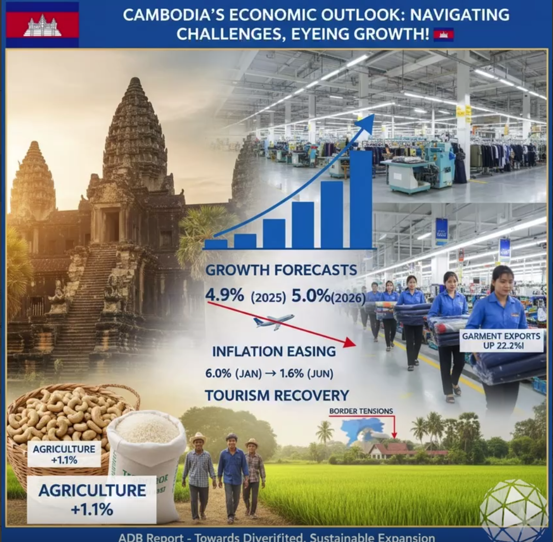 - ការព្យាករណ៍កំណើនដែលបានកែសម្រួល: ធនាគារ ADB បានកែសម្រួលការព្យាករណ៍កំណើនរបស់កម្ពុជាមកត្រឹម 4.9% សម្រាប់ឆ្នាំ 2025 និង 5.0% សម្រាប់ឆ្នាំ 2026។ ការកែសម្រួលទាំងនេះឆ្លុះបញ្ចាំងពីបញ្ហាប្រឈមសេដ្ឋកិច្ចបន្តបន្ទាប់ រួមទាំងភាពតានតឹងភូមិសាស្ត្រនយោបាយជាមួយប្រទេសថៃ និងការផ្លាស់ប្តូរនៅក្នុងទីផ្សារនាំចេញរបស់សហរដ្ឋអាមេរិក។