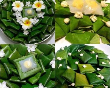 5. ទុកម្សៅនោះឱ្យត្រជាក់បន្តិច (ចៀសវាងម្សៅក្តៅធ្វើឱ្យស្លោកស្លឹកចេក) រួចសឹមធ្វើការវេចខ្ចប់។ ជាចុងក្រោយលោកអ្នកគ្រាន់តែដាក់ស្នូល(សណ្តែកដែលសូនរួច) ដាក់លើស្លឹក ហើយដួសម្សៅនោះដាក់ពីលើ រួចខ្ចប់វាជារាងបួនជ្រុងរៀបដាក់ចានជាការស្រេច