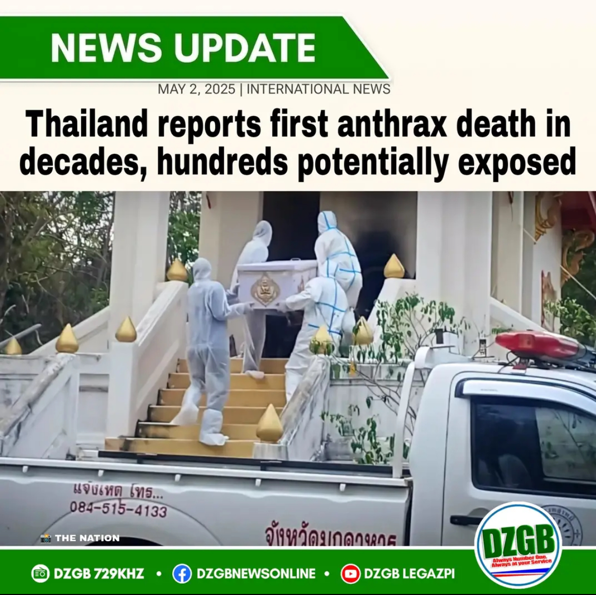 ➡️ស្រុក Don Tan នៃខេត្ត Mukdahan របស់ប្រទេសថៃ បានចេញសេចក្ដីប្រកាស ពីការស្លាប់របស់បុរសម្នាក់ដែលបានប៉ះពាល់ សត្វគោ ក្របី និបរិភោគសាច់គោ។ រួចក៏មានរោគសញ្ញា អង់ត្រាក់នៅលើស្បែក ហើយបានបញ្ជូនទៅមន្តីពេទ្យស្រុក Don Tan និងបន្តបញ្ជូនទៅមន្ទីពេទ្យខេត្ត Mukdahan ហើយក៏បានស្លាប់ បន្ទាប់ពីស្លាប់គ្រូពេទ្យបានសន្និដ្ឋានថាឆ្លងជំងឺអង់ត្រាក់។